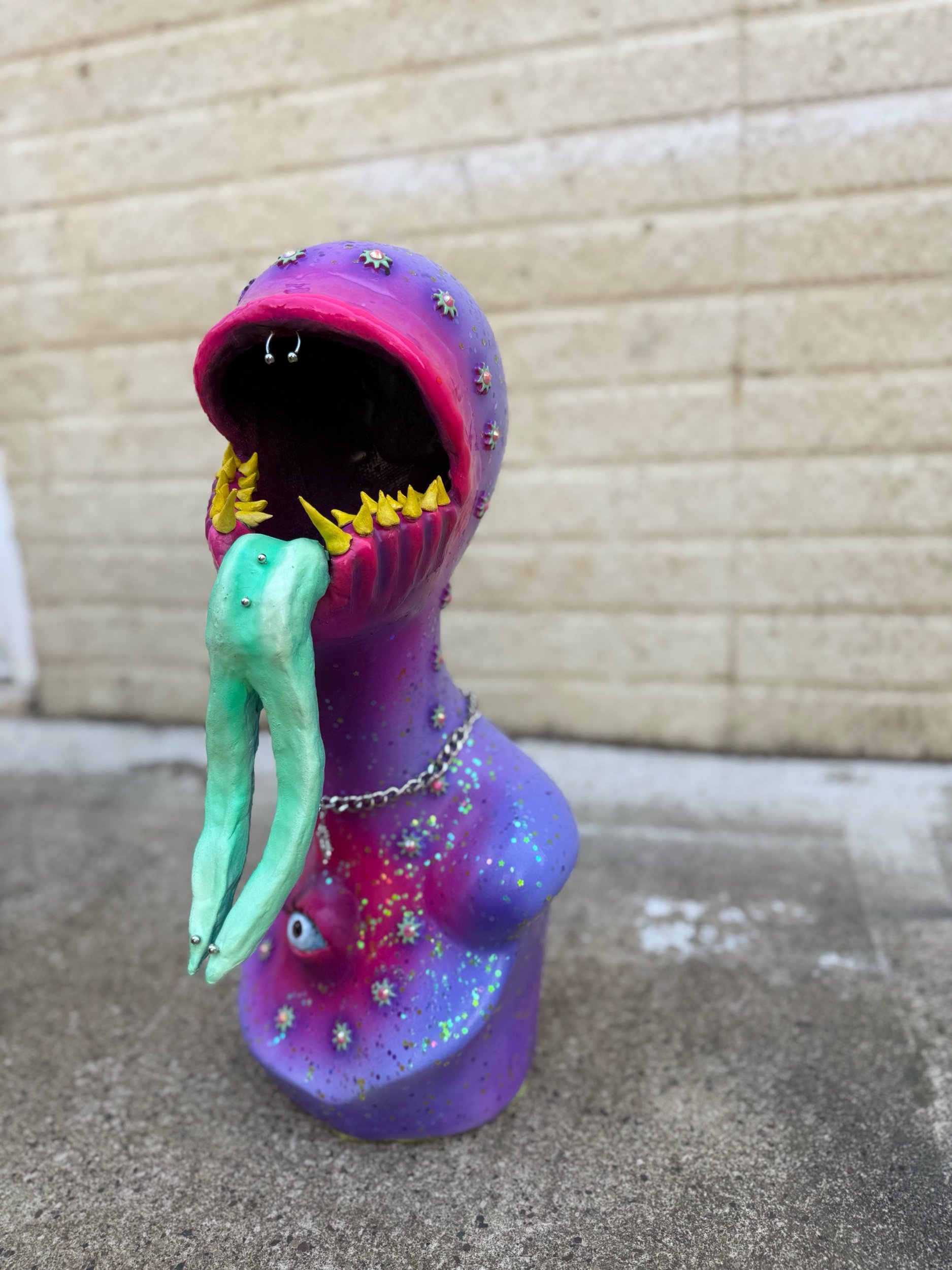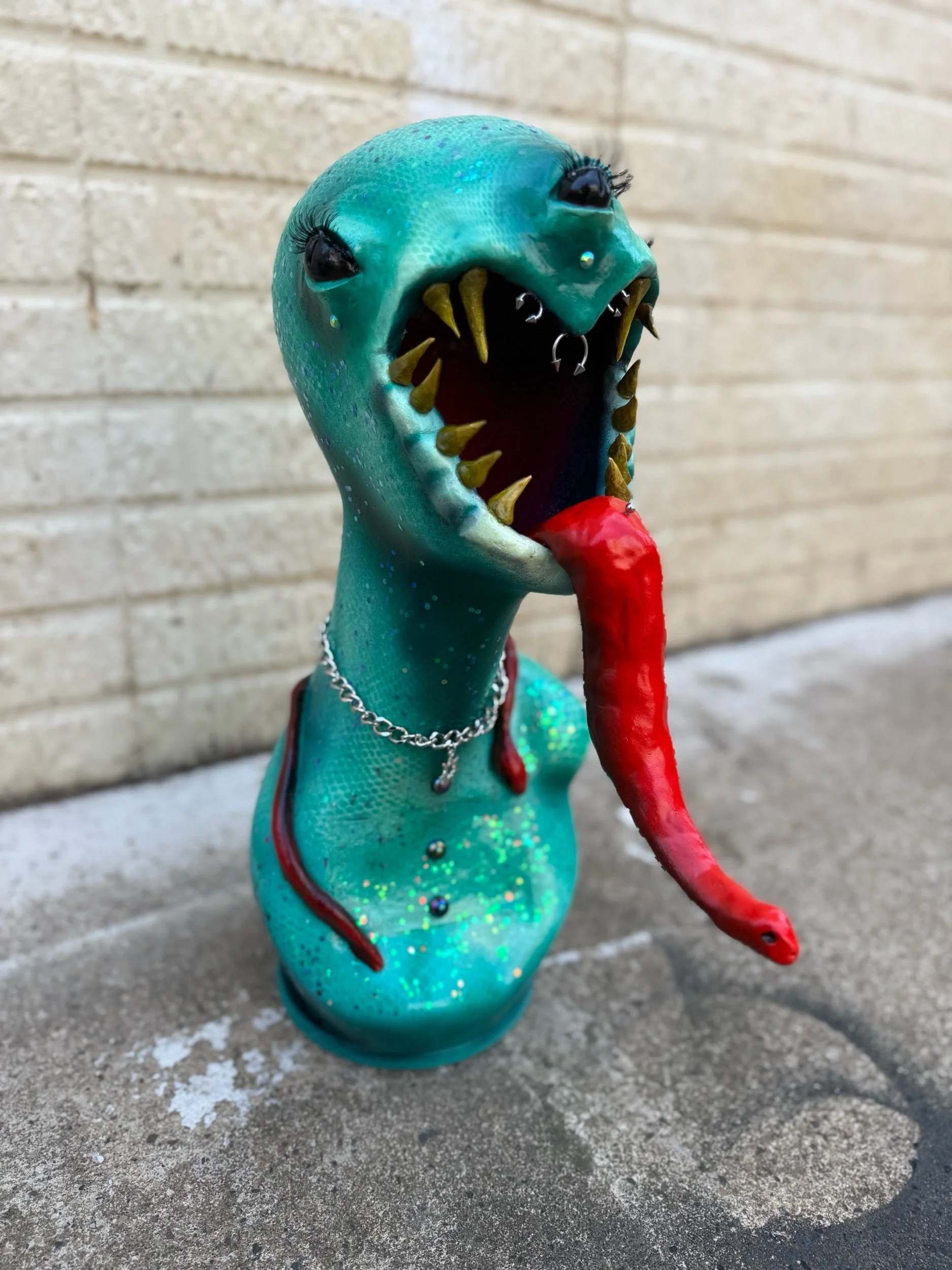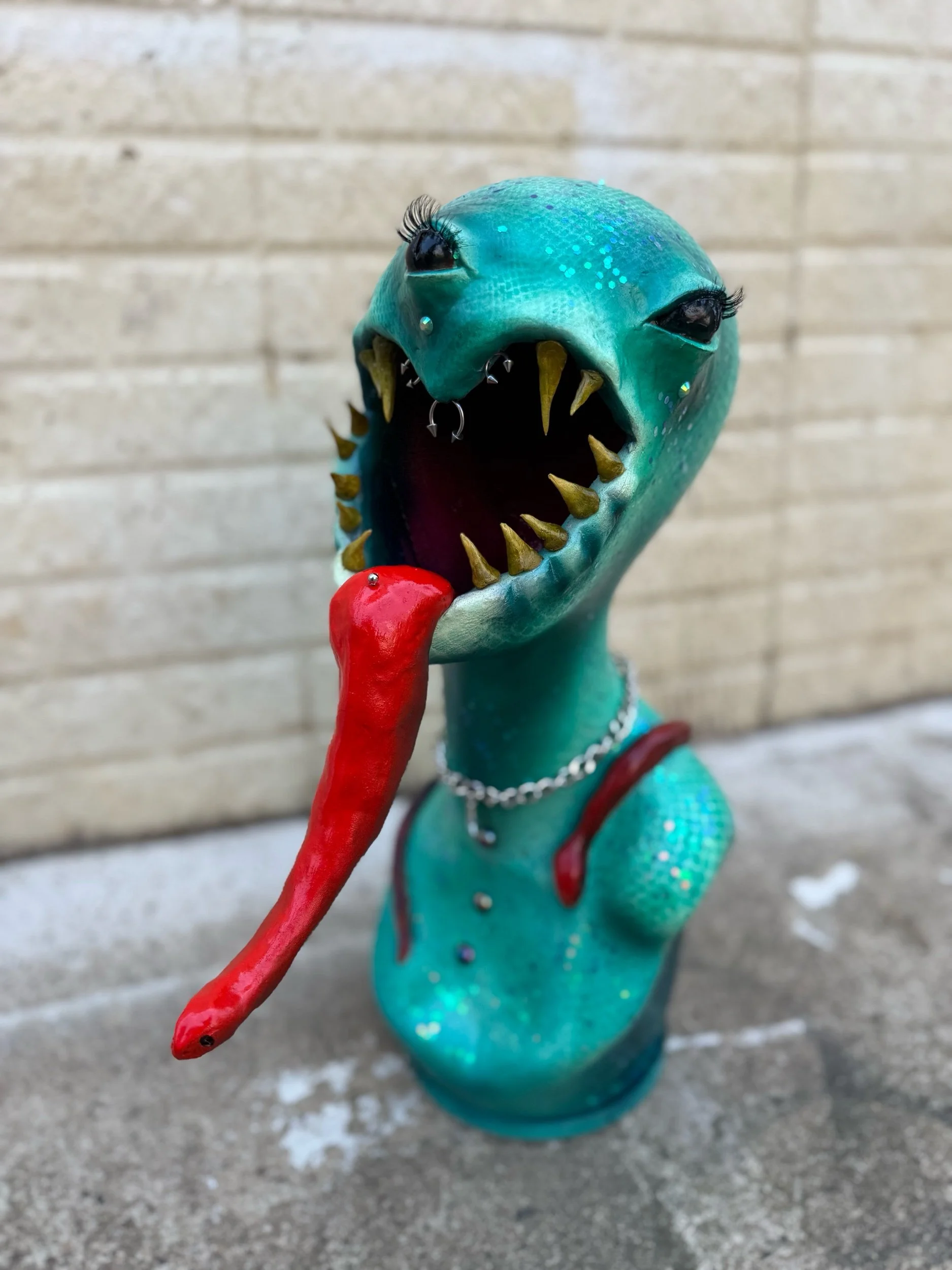 19”x7.5” Sculpture made from Fiberglass Mannequin Bust, Sculpted with clay, adorned with a wicked tongue, teeth, lashes, gems, piercings, and jewelry.