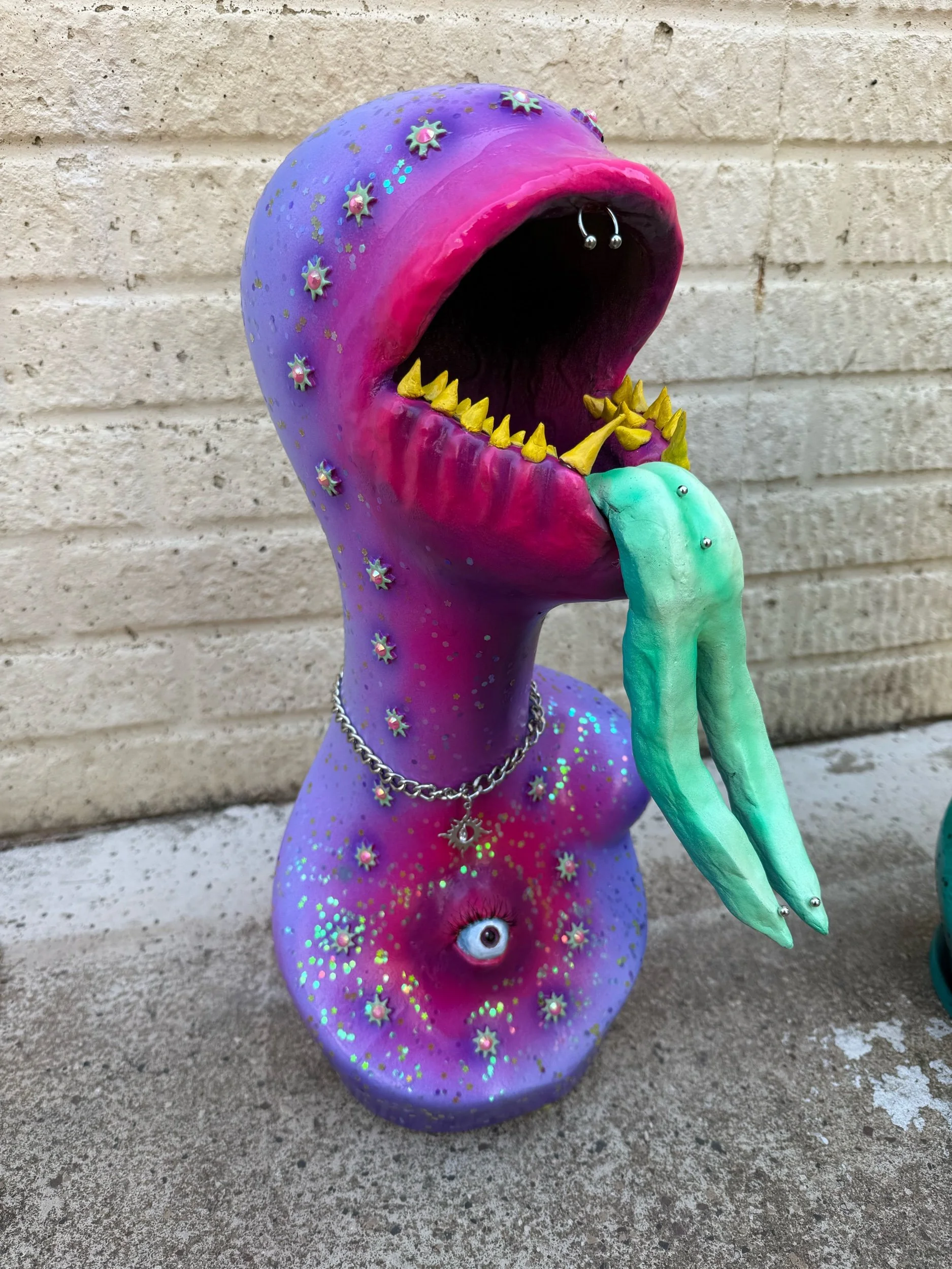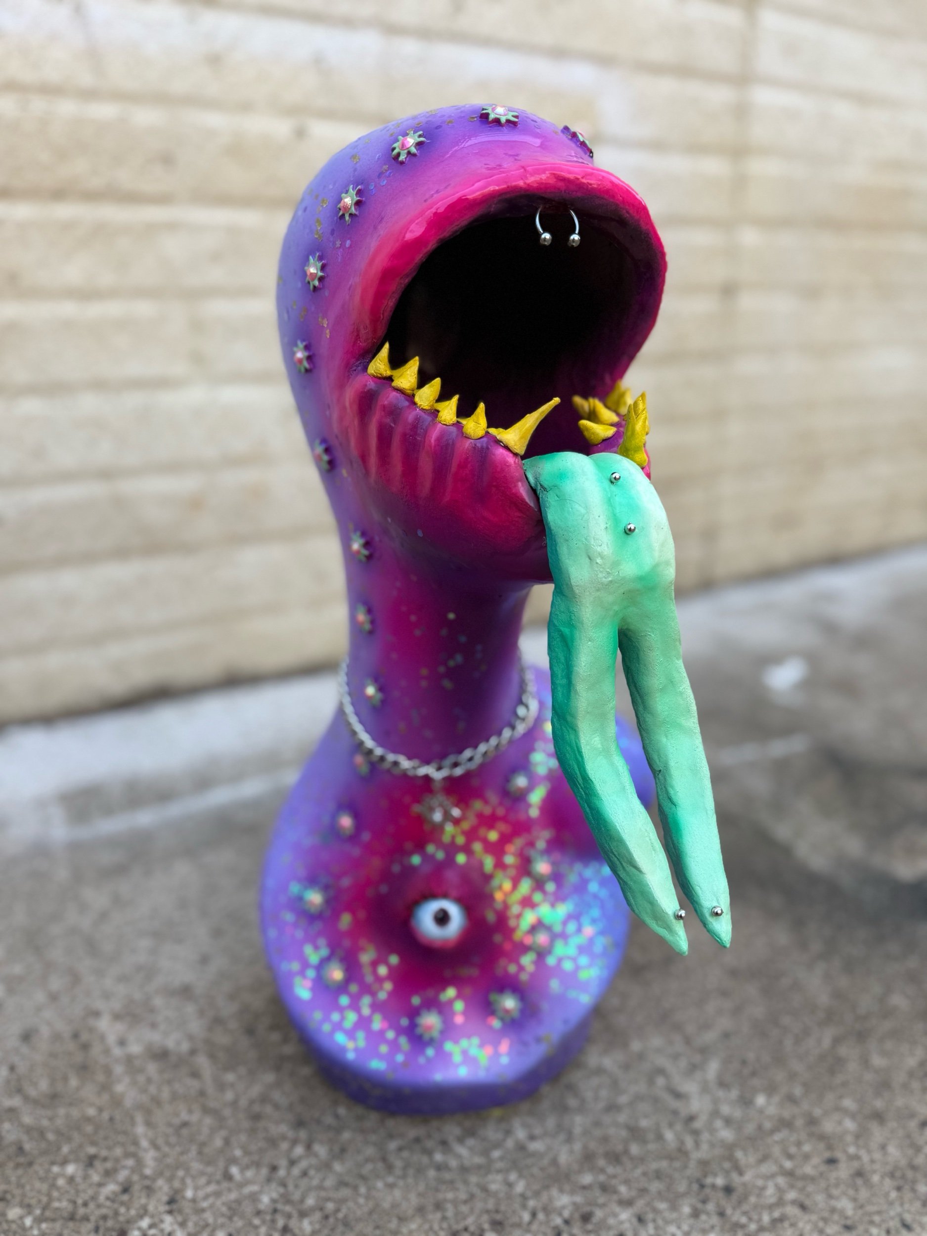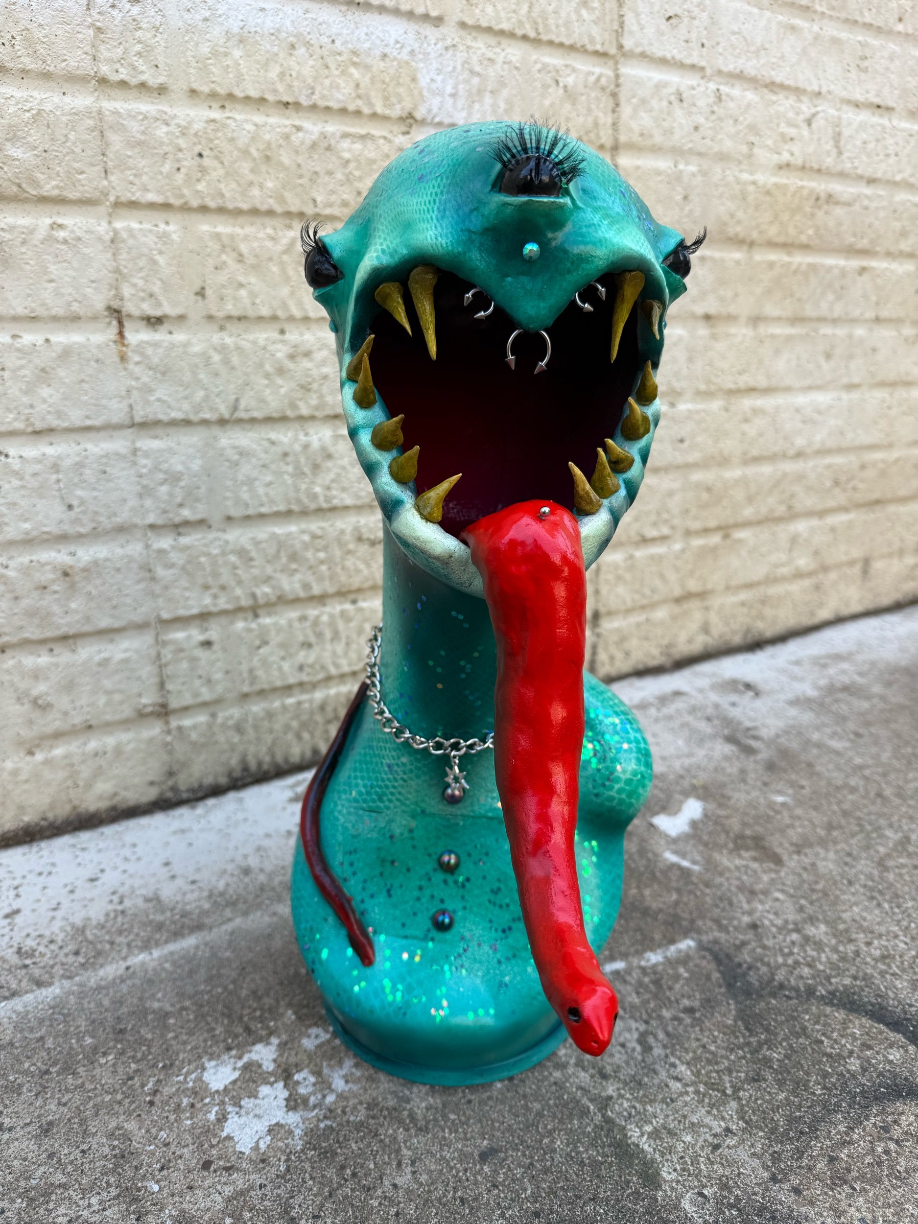 19”x7.5” Sculpture made from Fiberglass Mannequin Bust, Sculpted with clay, adorned with a wicked tongue, teeth, lashes, gems, piercings, and jewelry.